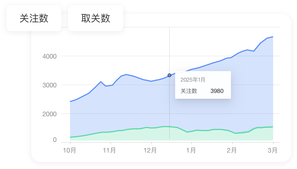关注增长报表,显示关注日、小时趋势、最高关注、取关数